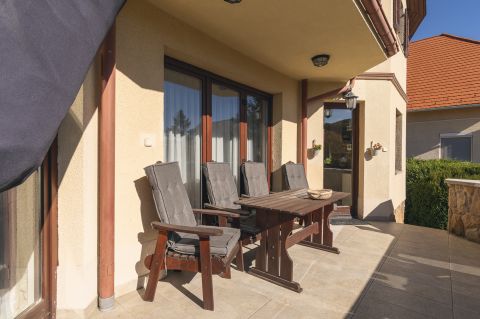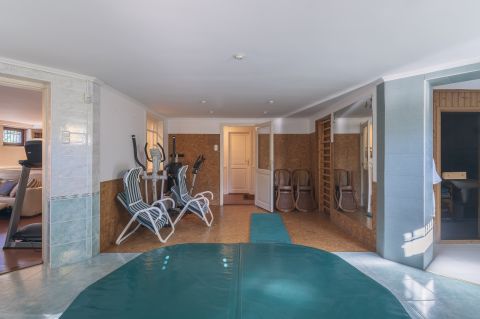 A családi ház átgondolt tervezés eredményeként az alsó szinten található 2 állásos gépkocsi tárolóval, jacuzzi, szauna, kondi- és hobby szoba, bortároló, kamra, tároló, mosó- és szárító helyiség, további tárolóval. Kertkapcsolatos ez a szint, így a privát napozó teraszra léphetünk ki innen.