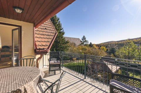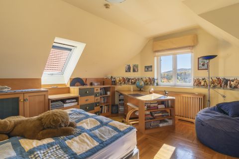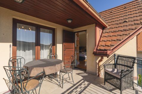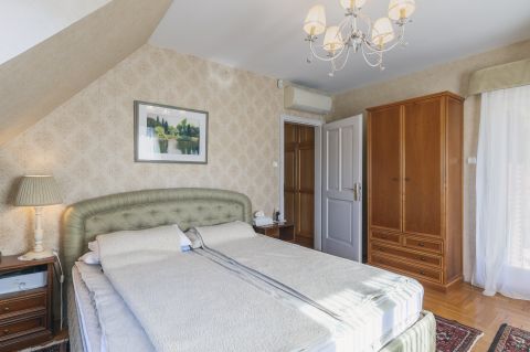 A felső szinten, a földszinti kialakításhoz hasonlóan a központi térben egy közösségi tér, zeneszoba, tőle balra a gyerekszoba és jobbra a szülői hálószoba. Mindhárom szobából kijárat a kb. 12 nm-es DNY-i tájolású, 180 fokos panorámával rendelkező erkélyre. A szülői hálóhoz kapcsolódik egy gardróbszoba és egy kádas fürdőszoba. A szinten található még egy további vendégszoba, saját tusolós fürdőszoba W.C.-vel.