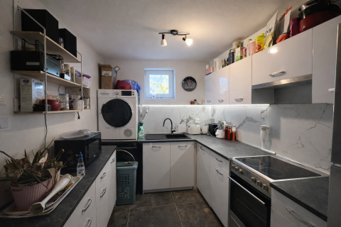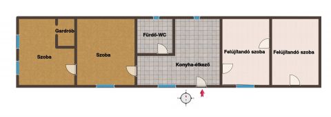 Az ingatlan jelenlegi kialakítása szerint 2 szoba, konyha-étkező, fürdőszoba-WC, gardrób, valamint fedett kocsibeálló tartozik hozzá. A lakótérből kb. 100 m² felújított, míg a fennmaradó részben két további szoba befejezése szükséges, így az új tulajdonos saját igényei szerint alakíthatja ki.