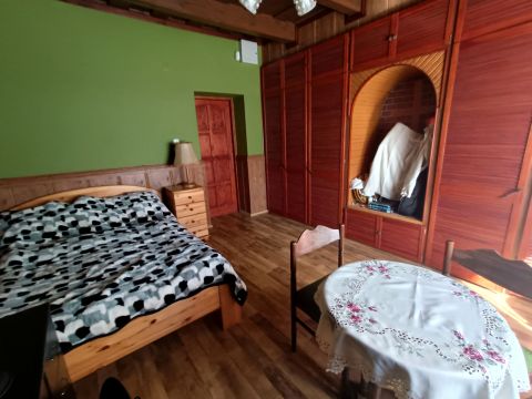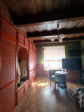 -Nagyszoba: 18 m², laminált padlóval és fa mennyezettel. Egyik oldala teljes egészében, mennyezetig érő, fából készült beépített szekrénnyel rendelkezik, amely a vételárban szintén benne foglaltatik.