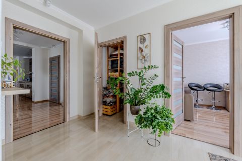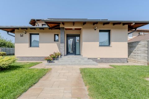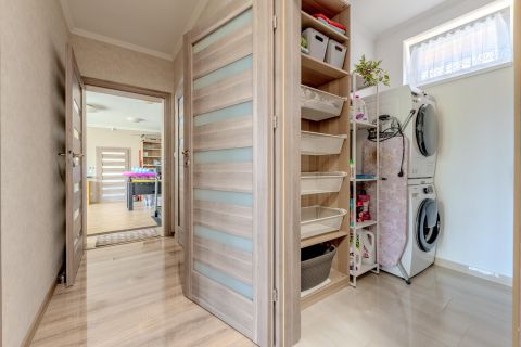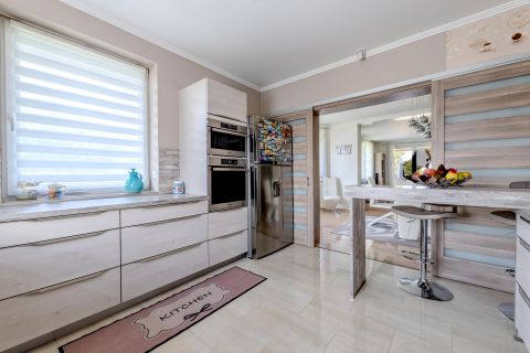 A földszinten elegáns nappaliétkező tér, három lakószoba, praktikus gardrób, valamint tolóajtóval szeparálható konyha kapott helyet, amely igény szerint egy légtérben vagy elkülönítve is használható.