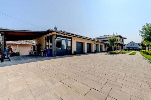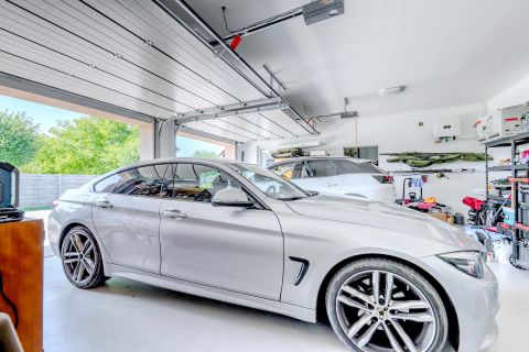 A duplagarázs két autó számára biztosít kényelmes parkolást, emellett további fedett autóbeálló is rendelkezésre áll, elektromos autó töltési lehetőséggel. A tárolók és háztartási helyiségek kiválóan szolgálják a rendszerezett otthoni működést.