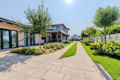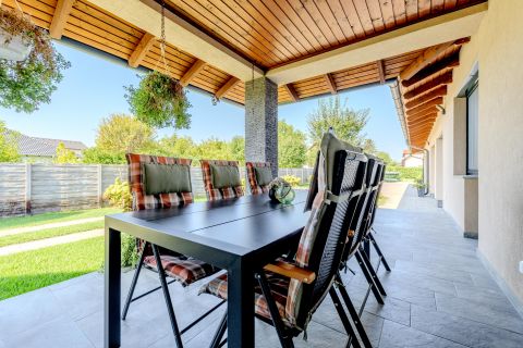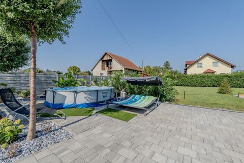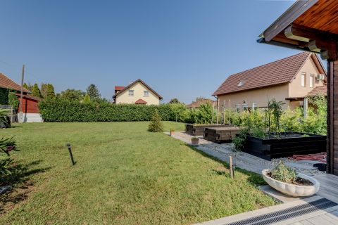 A házat körülölelő kert igényesen parkosított, rendezett, intim, ideális pihenésre, családi és baráti összejövetelekre.
