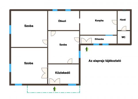 - Helyiségek: 2 hálószoba, konyha, étkező, előszoba, fürdő + wc, közlekedőrész, plusz egy külön helyiség, amelyből akár plusz szoba is kialakítható (a 11,5 m²-es közlekedőrészből).