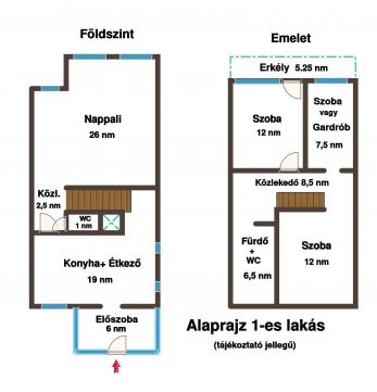 - nappali + három szoba (26, 12, 12 és 7.5 nm)