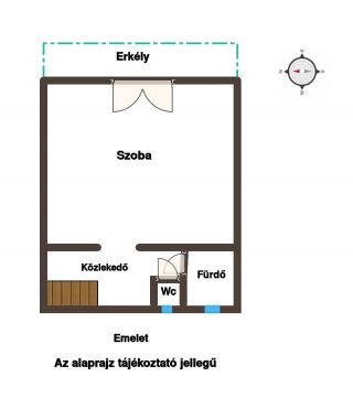 * emelet: szoba, zuhanyzós fürdő, külön WC