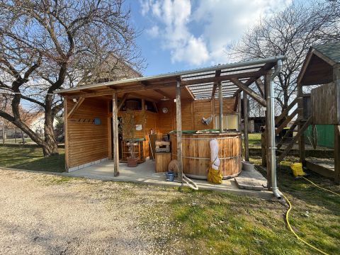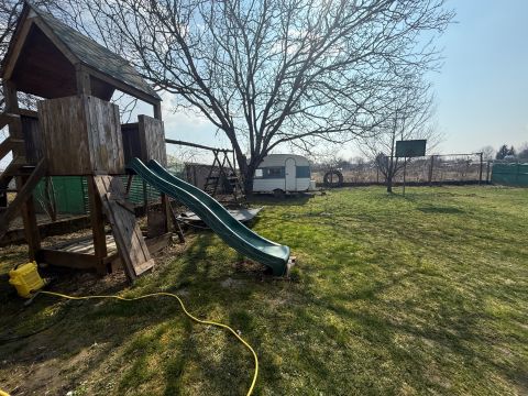 A telek teljesen sík 960 nm, garázs mellék épület és pince is megtalálható, valamint a tulajdonos kialakított egy 4-5 fős szaunát és a mellette lévő merülő dézsát + tusolót,teljes gépészettel ami teljesen fedett és télen nyáron használható.