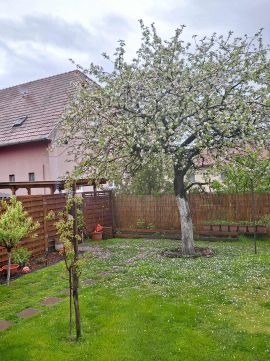 Rendezett kert gyümölcsfákkal, virágokkal