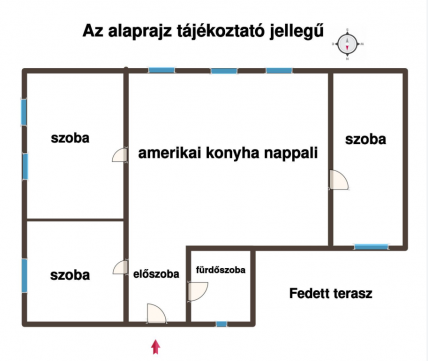 amerikai konyhás nappali + 3 külön nyíló szoba, így többgyermekes család számára is kényelmes életteret biztosít.