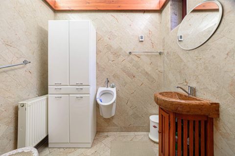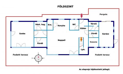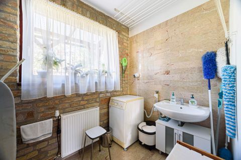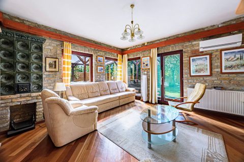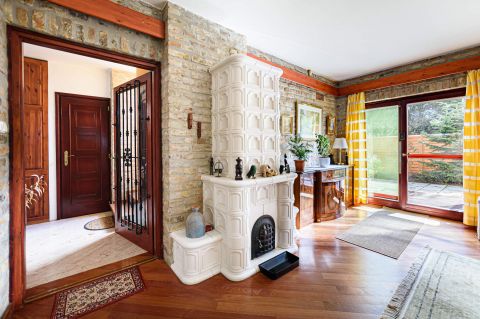 A főbejáraton belépve egy tágas, elegáns kőburkolatos előtér fogad. Innen jutunk a teraszkapcsolatos, napfényes amerikai konyhás nappali-étkezőbe, amelyet a ház igazi ékköve, a gyönyörű, egyedi cserépkályha tesz különlegessé hangulatban és funkcióban egyaránt.