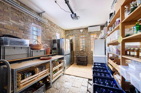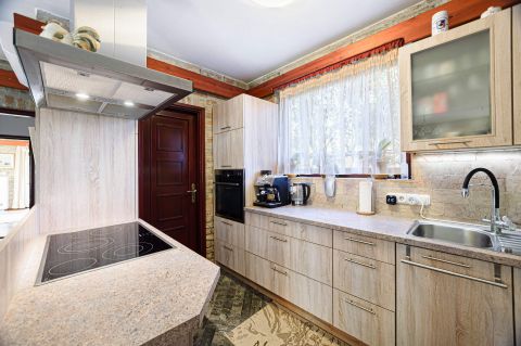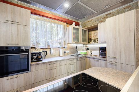 A modern, gépesített konyhát egy praktikus kamra egészíti ki.