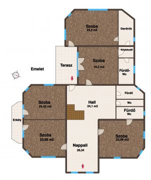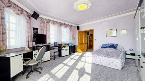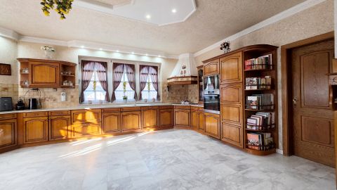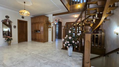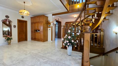 A földszinten többek között van egy tágas konyha-étkező, egy 50 m2-es nappali, egy dolgozószoba, fürdőszobák, innen egy impozáns, ívelt lépcső vezet az emeletre, ahol négy napfényes hálószobát, konditermet, 3 fürdőszobát, közösségi helyiségeket, erkélyeket találunk.