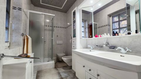 Burkolatok: a hálószobákban padlószőnyeg, a többi helyiségben (összesen 410m2-en) görög márvány burkolat, küszöb nélkül.