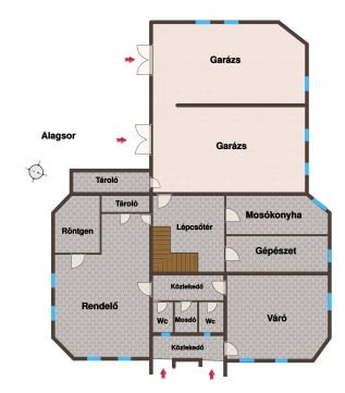 Az alagsori részen található egy fogorvosi rendelő, váró, szociális helyiségek, mosókonyha és a gépészeti helyiség. Ezen kívül két, egyenként 32 m2-es teremgarázs is helyet kapott.