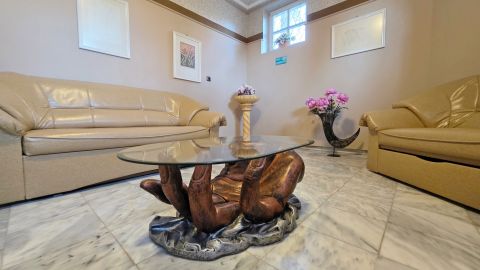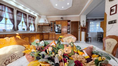 A villa szinte minden helyiségében egyedi tervezésű, méretre készült, antikolt tölgy bútorok találhatóak. A konyhapult és a rendelői bútorok egyedi, hézagmentes Corian munkalapokkal lettek ellátva.