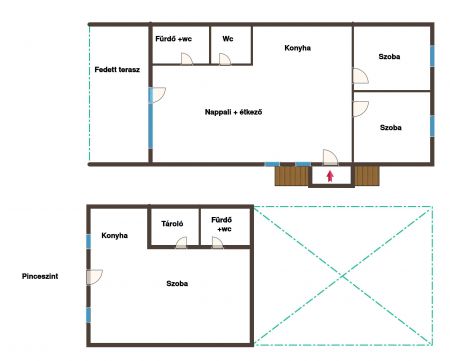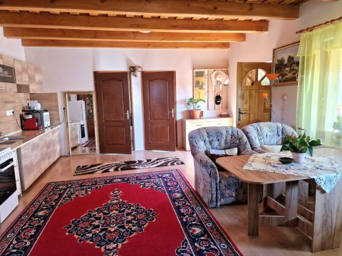 Külön bejárattal a pinceszinten egy szoba konyhás, fürdőszobás külön kis lakrészt alakítottak ki, mely kiválóan alkalmas vendégfogadásra, hosszú és rövidtávú kiadásra egyaránt.