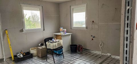 Padlószerkezet rétegrend elkészítve, padlófűtés cső rendelkezésre áll (600 m)