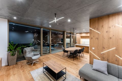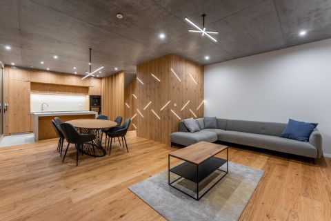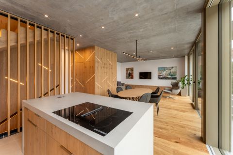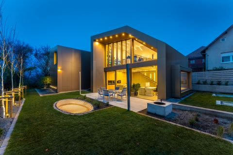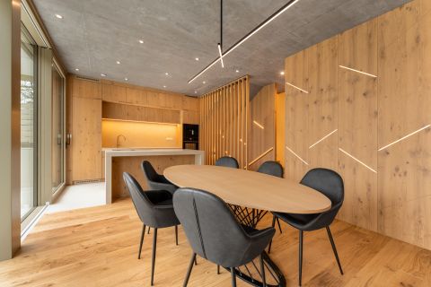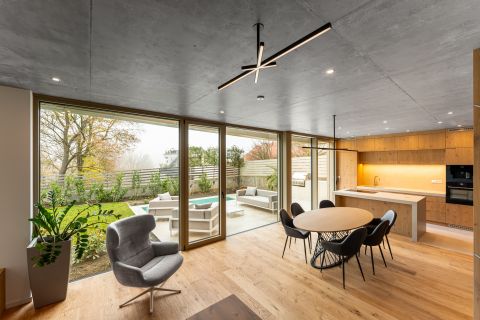 A villa lélegzetelállító első benyomása a padlótól mennyezetig érő üvegfelületekben rejlik. A nappalikonyhaétkező szinte egyetlen, fényben úszó térként tárul fel, ahol a kert és a ház közötti határ gyakorlatilag eltűnik. A belsőépítészeti megoldások a modern minimalizmust és a természetes anyagok időtálló eleganciáját egyensúlyozzák: tölgy furnéros egyedi bútorok, látványbeton felületek, gondosan komponált fények és letisztult vonalak teszik teljessé az élményt.