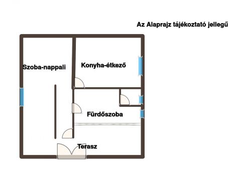 Belső elrendezése praktikus és otthonos: egy tágas nappali-hálószoba, konyha-étkező, fürdőszoba WC-vel, valamint egy külön háztartási helyiség került kialakításra. A szoba meleg hangulatát parketta adja, míg a többi helyiség járólappal burkolt.