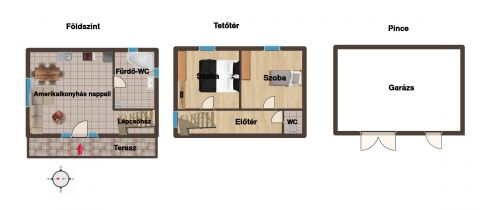 - Az alsó szinten egy amerikai konyhás nappali, fürdőszoba WC-vel található, ideális a mindennapi kényelmes élethez.