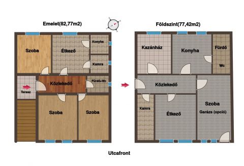 A földszinti lakrész - 77,42m2, az emeleti lakrész - 82,77m2.