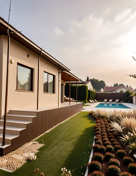 Nyáron a kertben a gyerekek részére betonozott alapra lehet úszómedencét felállítani fák árnyékában.