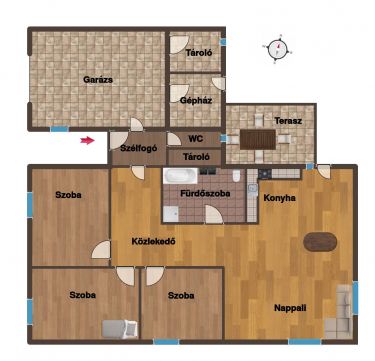 Az közlekedőből nyíilik 3 hálószoba, egy fűrdőszoba WC -vel és egy amerikai konyhás nappali. A ház rendelkezik egy kisebb tárolóhelyiséggel bent az ingatlanban.