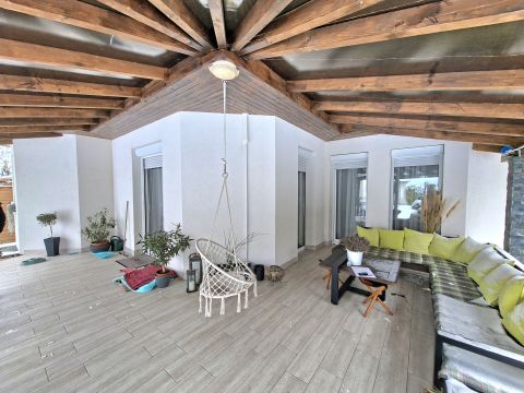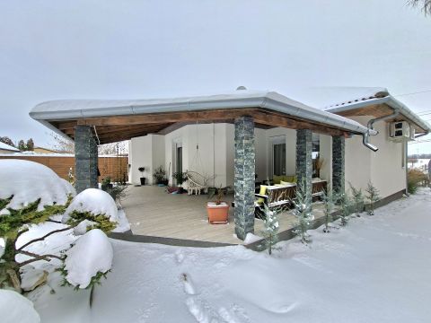 A fő épület 80m2- es 2 szoba,(3 szoba kialakítása is lehetséges) amerikai konyhás nappali, fürdőszoba-wc, wc, háztartási helyiség, és a hálószobából valamint a nappaliból is a 24 m2- es fedett teraszra való kilépéssel.