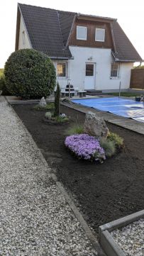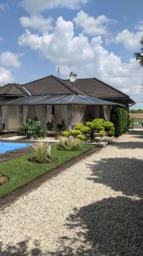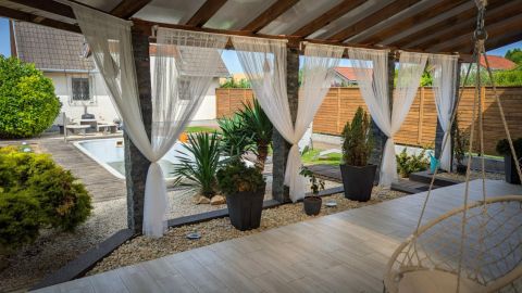 A két ház között 7mx 3,5 m- es 1,5 m mély fedett medence található gyönyörű parkosított környezetben.