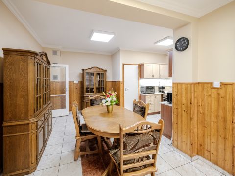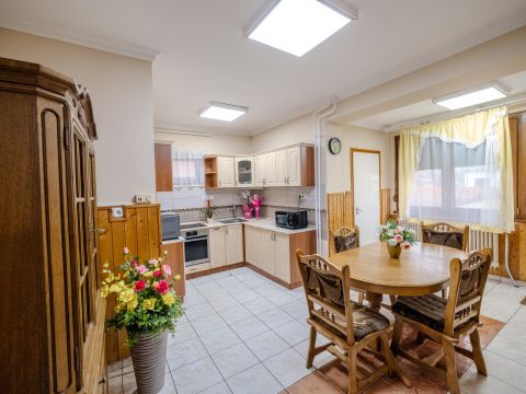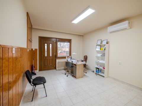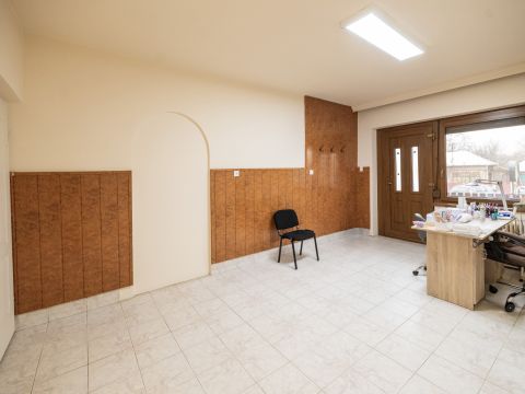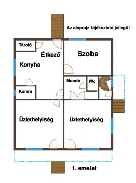 - 1. emeleten: 2 üzlethelyiség, mosdóval, Wc-vel, 1 külön bejáratú szoba, konyha+étkező, kamra, fürdőszoba, Wc, közlekedő
