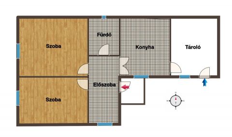 Elosztás: 2 szoba, konyha, kamra, fürdőszoba, előszoba
