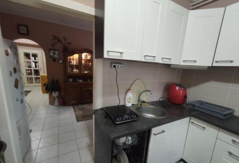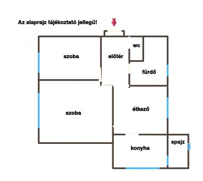 A ház elrendezése praktikus: folyosó, 2 szoba, étkező, konyha, fürdőszoba, külön WC és spájz.