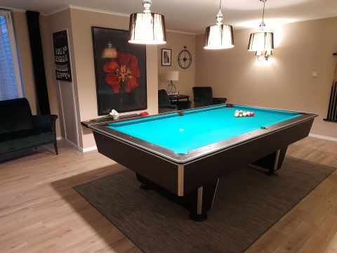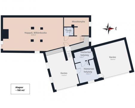 2 különálló garázs, amely akár 3 autó tárolására is alkalmas, a garázsból közvetlen bejárás lehetséges a házba. Az alagsori szinten bár és billiárdszoba van kialakítva, mely nagyon hangulatos, és alkalmas nagy társaságok fogadására.