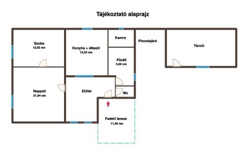 A jelenlegi kialakítás nappali + szoba, konyha-étkező, külön fürdő és WC, valamint kamra, de a tetőtér beépítésével további 3 szoba alakítható ki. A bővítéshez szükséges építészeti tervek már elkészültek, a talajmechanikai vizsgálat is rendelkezésre áll, így a legidőigényesebb előkészítési lépéseken már túl van az ingatlan.