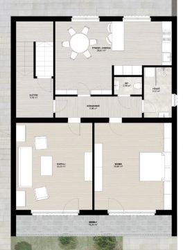 Tágas, világos otthoni élettér prémium burkolatokkal, egyedileg gyártott bútorokkal, előszoba, 2szoba, étkező-konyha, fürdő, WC, és egy 12 m²-es terasszal, ahonnan gyönyörű panoráma nyílik a környékre.