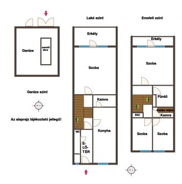 A ház kelet-nyugati fekvésű, a 2 nagyszoba keleti fekvésű, melyek mindegyike erkélyes és a belső udvarra néz. A két kisebbik szoba nyugati tájolású és ablakaikból utcai kilátás nyílik. Mindkét szinten található egy-egy fürdőszoba WC-vel, amelyek kényelmet nyújtanak a mindennapok során.