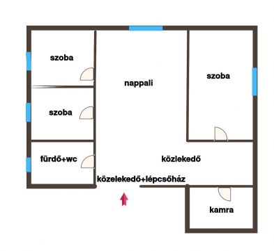 Földszint: előszoba, nappali + amerikai konyha, 2 szoba, fürdőszoba, külön WC, lépcsőház