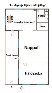 Az elrendezése: Nappali, hálószoba, konyha étkezővel, továbbá fürdőszoba WC-vel és egy kamra. A konyha alatt pince is található, mely kb 15 nm.