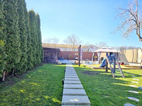 MEDENCÉS CSALÁDI HÁZ!!! Pécs gyárvárosi részén eladó egy pár éve teljeskörűen felújított, nettó 100 nm alapterületű, 2 szintes, jelenleg amerikai konyha-nappali+ 4 szoba elosztású, sok extrával felszerelt, gáz kazánnal fűtött, klímás, tégla családi ház, épített medencével, nyári konyhával, 160 nm-es műhely garázzsal, alagsori tárolókkal, duplagarázzsal, térkövezett, udvari beálókkal, 1000 nm-es parkosított telken.