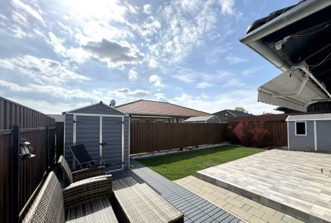 A 220 m²-es telek rendezett, elöl esztétikus díszkerttel, hátul füvesített pihenőkerttel. Tárolók elöl és hátul is rendelkezésre állnak, az udvarba két autóval is be lehet állni. Az ingatlan elektromos kapuval, riasztóval és kamerarendszerrel felszerelt.