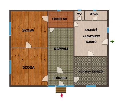 Jelenlegi hasznos lakrészen 2 egész méretű nagy szoba, nappali, konyha-étkező, előszoba, fürdő és wc lett kialakítva. Ezen felül található a tároló, amiből jelenleg a padlást és a 16 nm-es pincét lehet megközelíteni. És innen nyílik egy kis wc, és spejz.
