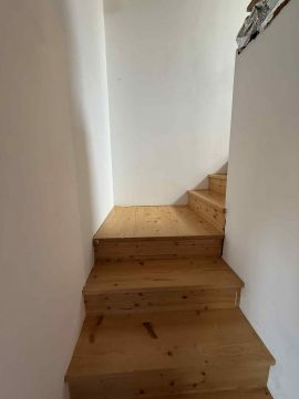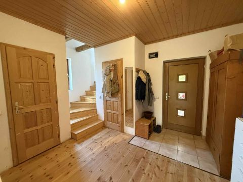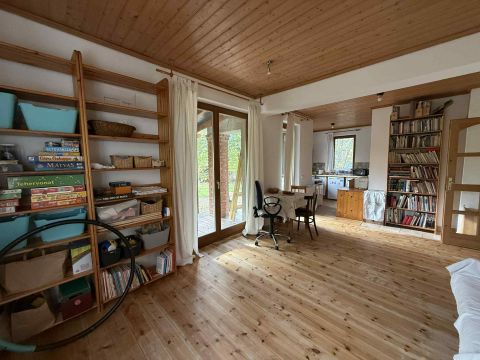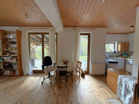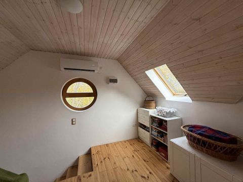 A földszinten és a tetőtérben is természetes fa burkolatok: hajópadló, lambéria