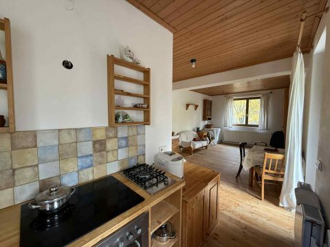 Földszint: amerikai konyhás nappali kandalló előkészítéssel, konyha kerámialapos villanytűzhellyel és wok gázfőzőlappal, szoba, előszoba, kamra, fürdőszoba, külön WC, fedett terasz