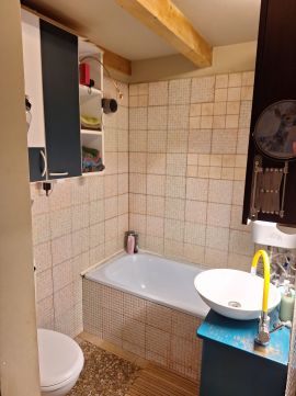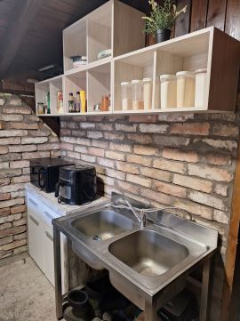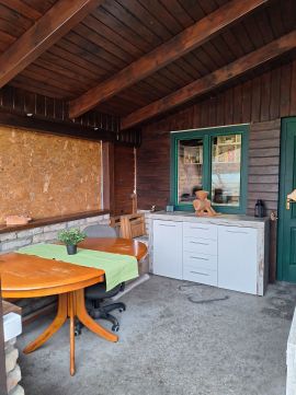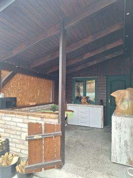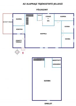 földszinten: 72 m2: 2 szoba, nappali, konyha, kamra, fürdőszoba 3 Wc, tároló, fedett terasz és nyitott terasz