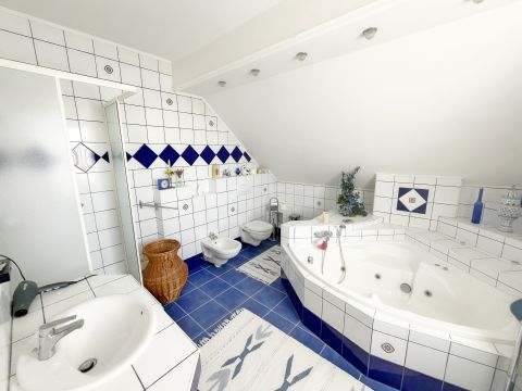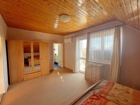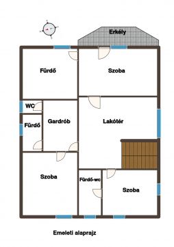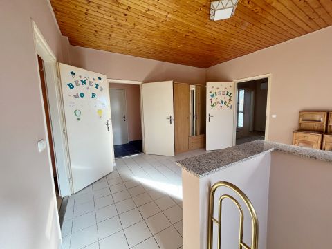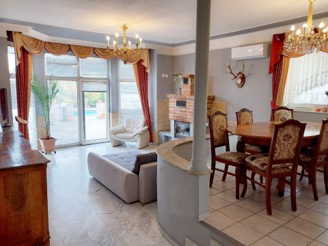 A Bruttó 180 m2-es lakóterű ingatlan alsó szintjén található egy tágas, teraszkapcsolatos nappali, konyha, fürdő, wc és két szoba. A felső szinten három szoba, mindhárom szobához saját fürdőszoba és wc tartozik. Az ingatlan alápincézett, több különálló helyiséggel rendelkezik, ahol akár saját vállalkozását is üzemeltetheti az új tulajdonos.