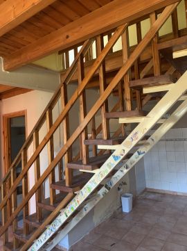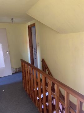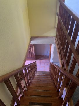 Beosztása nappali-konyha, fürdő/WC, előszoba és előtér a földszinten és 3 szoba közlekedővel az emeleten. Az egyik szobához erkély is tartozik.
