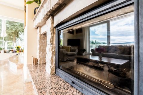 Központi Zóna: Amerikai konyhás nappali, hangulatot teremtő kandallóval.