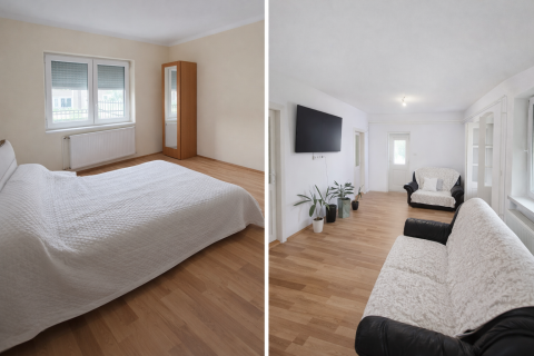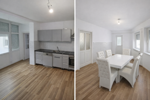 Tágas, frissen festett,új laminált lappal lerakott helyiségek
