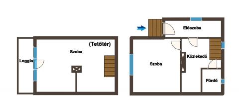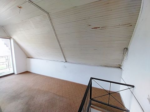 A házban egy előszoba, fürdőszoba, közlekedő, egy földszinti szoba és egy tetőtéri szoba található, melyből egy loggia nyílik.