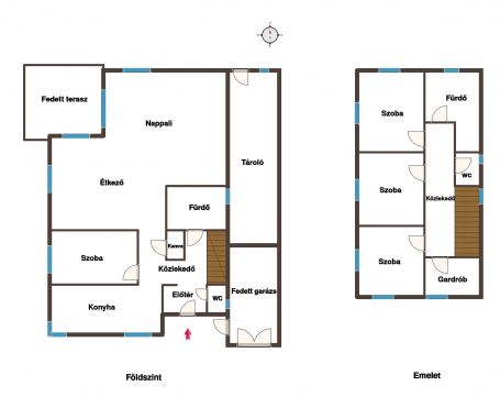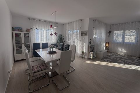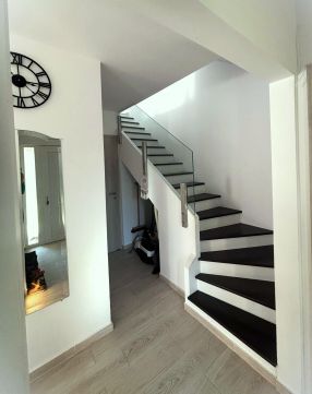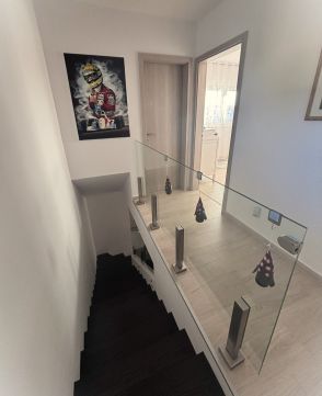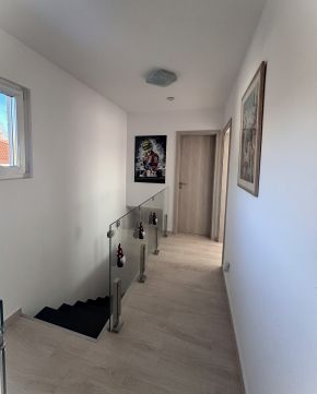 Az alsó szinten egy külön üvegajtóval leválasztható modern konyha, kamra, hálószoba, étkező, nappali, fürdőszoba és WC helyezkedik el. A felső szinten található további 3 db. 11 m2-es szoba, fürdőszoba, WC és egy dolgozószoba helyiség.